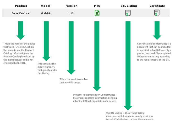 - PICS – La déclaration de conformité de l'implémentation du protocole (Protocol Implementation Conformance Statement) contient des informations définissant toutes les fonctionnalités BACnet d'un appareil. Les PICS sont disponibles pour tous les produits de la liste BTL et peuvent être téléchargés directement à partir de la page de liste des produits.
